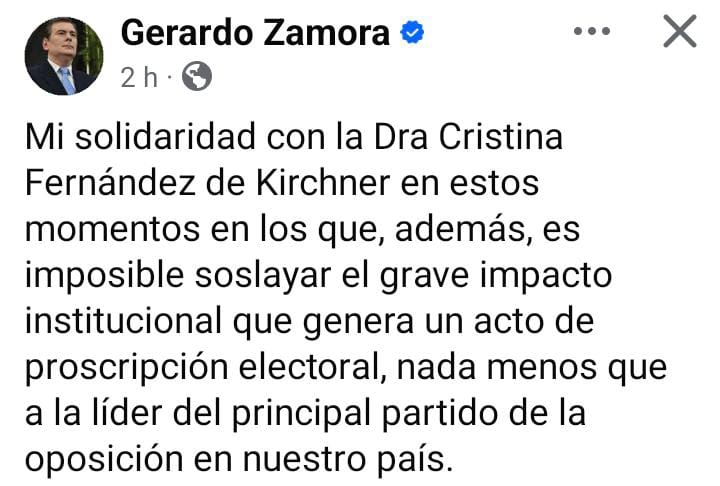 A través de sus redes sociales, el mandatario santiagueño expresó su solidaridad con la exjefa de Estado, al tiempo que advirtió sobre las consecuencias institucionales de la sentencia. «Mi solidaridad con CFK Argentina en estos momentos, en los que además, es imposible soslayar el grave impacto institucional que genera un acto de proscripción electoral, nada menos que a la líder del principal partido de oposición en nuestro país«, publicó.